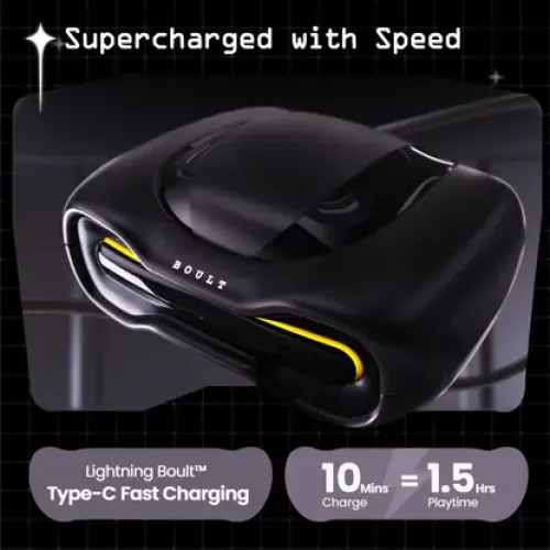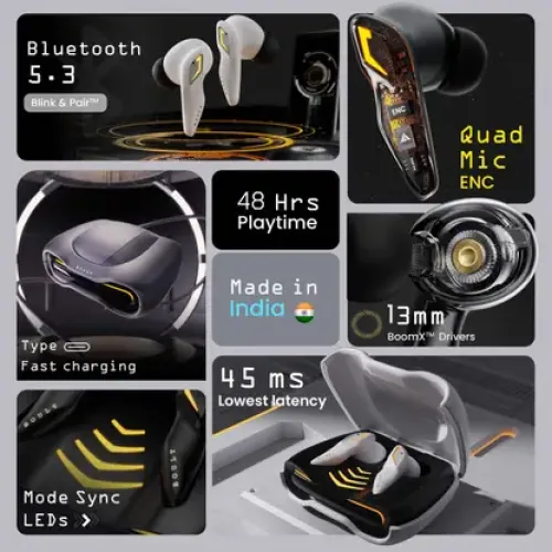 Upgrade your gaming experience with the Boult Astra earphones. Dominate the gaming world with 48 hours of play time and 120 hours of standby time, ensuring your gaming sessions are uninterrupted. Enjoy Lightning Boult Type-C fast charging, and get 100 minutes of play time with just 10 minutes of charging. Communicate seamlessly with ZEN Quad Microphone ENC for enhanced call clarity. Activate Battle Game Mode with ultra-low 45ms latency for seamless and responsive gaming. The Breathing LED feature adds a dynamic visual element that syncs with your every move. Show off your style with classic color variants like Glossy Black, Opal White, and Smoked Metallic. Experience fast pairing with Blink & Pair and Bluetooth 5.3 technology to ensure you’re always ready for action. Immerse yourself in audio with innovative BoomX technology and 13mm drivers that deliver powerful, superior bass. Navigate easily with touch controls and access your voice assistant for convenient commands. IPX5 water resistance for long-lasting durability, allowing you to play confidently in any environment. Boult Astra earphones are your ideal gaming companion to help you dominate the field and win.